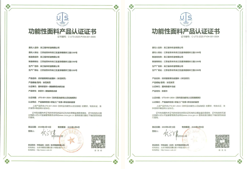 自主研发的防紫外功能、接触瞬间凉感功能面料荣获中联品检(北京)技术集团有限公司功能性面料产品认证证书,标志着吴江福华在功能性面料领域的研发能力、生产工艺及产品质量达到国内领先水平。